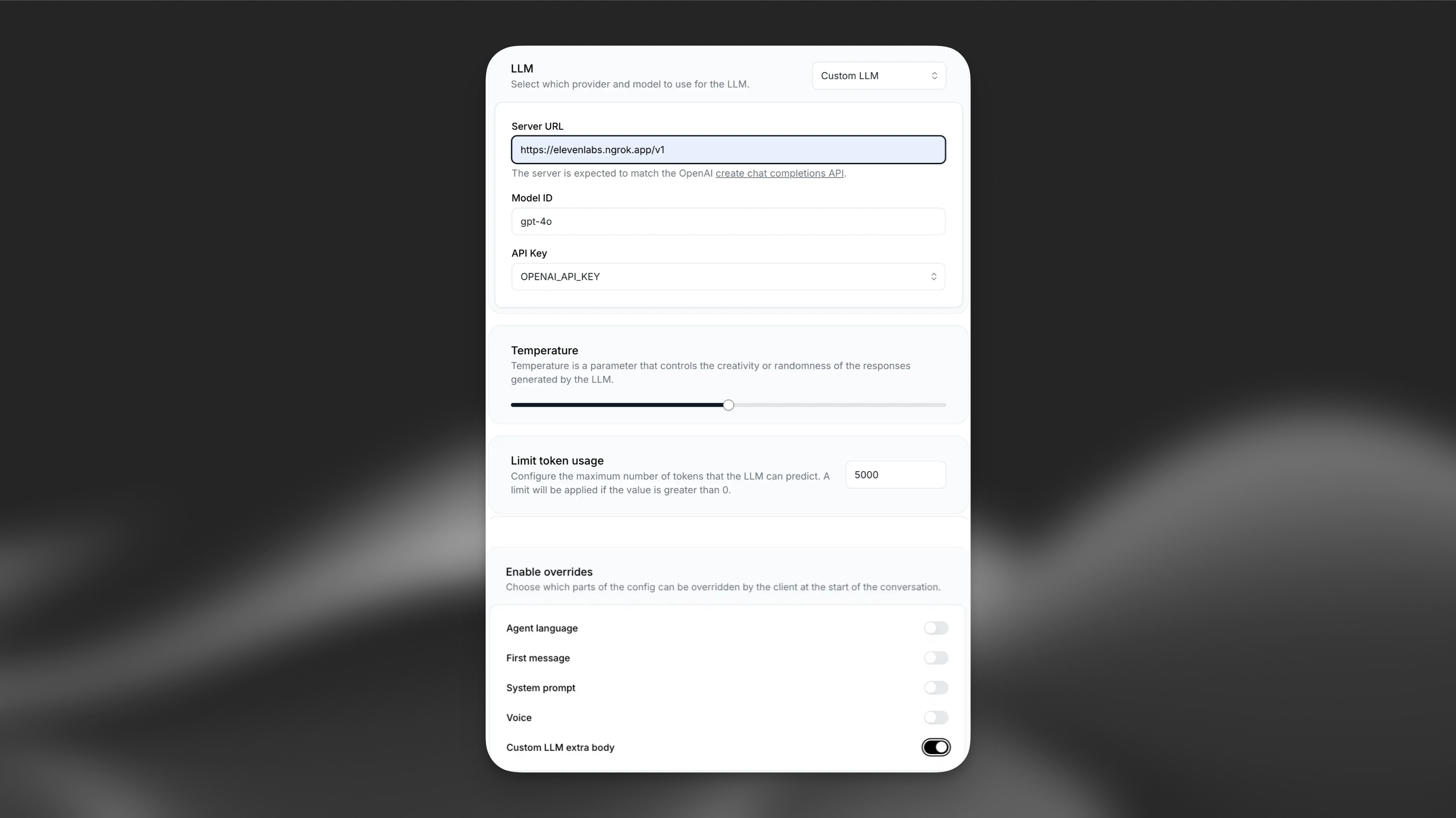 Direct your server URL to ngrok endpoint, setup “Limit token usage” to 5000 and set “Custom LLM extra body” to true.